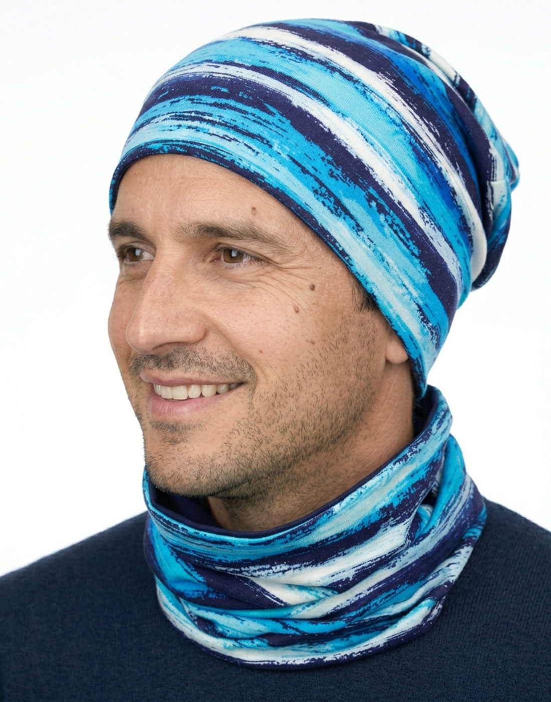 Pánska čiapka a nákrčník Pruhy zaujme sviežim pruhovaným dizajnom v kombinácii svetlomodrej, tyrkysovej a tmavomodrej. Vzor pôsobí dynamicky, športovo a zároveň moderne.